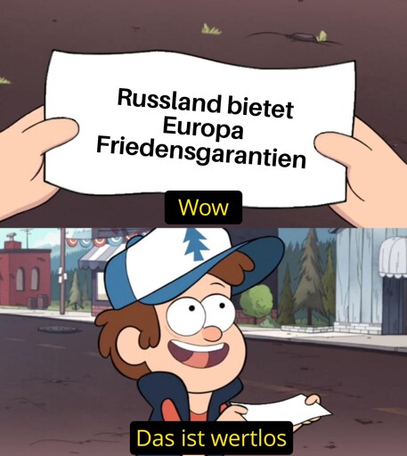 Schon absurd, dass die es immer noch versuchen und dass denen immer noch Leute glauben nach all den Friedensgarantien, die sie in den letzten Jahren gebrochen haben. Alleine gegenüber der Ukraine sind es jetzt schon mindestens 3? 4? 5? und sie führen da gerade aktiv Krieg.