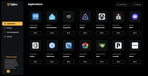 The main difference is that Safebox is software that runs on any operating system with a single command using docker. There’s no need to use terminals and commands later on. Like Yunohost, you can install and manage self-hosted apps with it, but it also includes geo-redundant backup and remote access features, all in one interface.