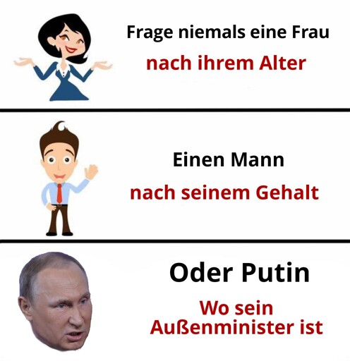 "Hahaha, der sitzt. Frag nie eine Frau nach ihrem Alter, nie einen Mann nach seinem Gehalt und vor allem nie in Russland danach, wo der Außenminister steckt. Makaber, aber trifft den Nagel auf den Kopf.