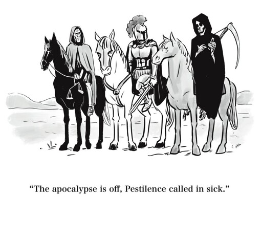 Pestilence is sick, war is injured, hunger ducked off to get a toastie and death… don’t even ask.