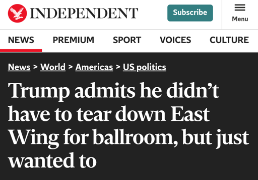 arrow-up1866arrow-down1imageTrump admits he didn’t have to tear down East Wing for ballroom, but just wanted topiefed.cdn.blahaj.zoneio@piefed.blahaj.zone to Not The Onion@lemmy.worldEnglish · 9 days agomessage-square135linkfedilinkfile-text