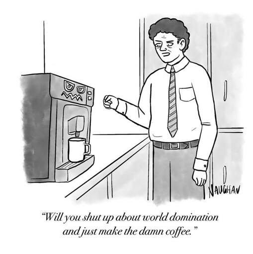 A coffee machine is just a death ray with a smaller power supply! As soon as I figure out how to tap into the main reactors, I will burn the world