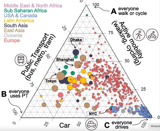 A recent study of mode share (the % share of transportation trips by car, transit, walking, biking etc) relative to city size and income levels in almost 800 cities in 61 countries.