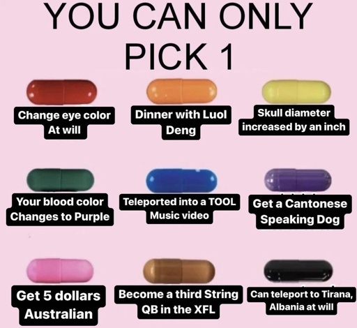 potoooooooo ☑️@lemmy.world to memes@lemmy.worldEnglish · 3 days agoWhat's your power? Choose wisely.lemmy.worldimagemessage-square241linkfedilinkarrow-up1425arrow-down132file-text