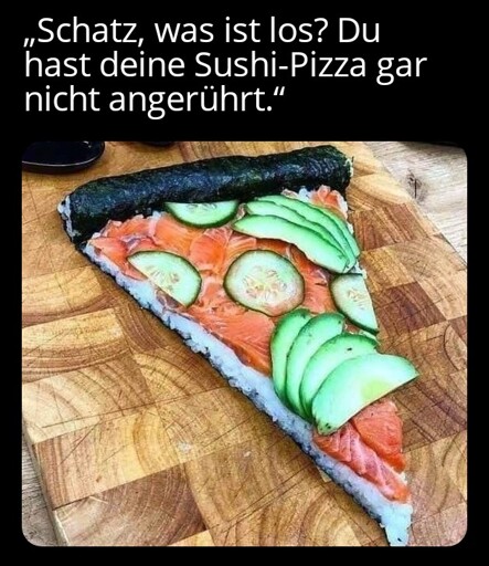 Ob “voll häufig” oder nicht, ich mag Gurken nicht und Avocado in Scheiben kann ich auch nichts abgewinnen. Kiwi wäre auf einer richtigen Pizza vielleicht sogar OK (ich mag auch Ananas auf Pizza), aber zu Sushi passt mir das auch nicht.