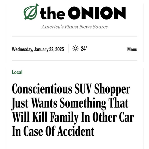 This honestly sounds likely. My step-mother, in the 80s, said something like this when she got an SUV (before the term had even kicked in). She felt safer and more confident being higher than the rest of the traffic. I “get it”, but it’s a race to the bottom (or top?). Maybe if they get tall enough, some of us can get ultra efficient and low profile wedge shaped cars and just dodge underneath these gigantic abominations.