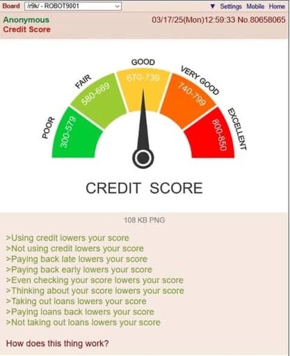It stopped being a can the applicant afford their current outgoings and afford this loan type system a loooong time ago. Now it’s a noose round the neck of anyone that has ever lost a job and missed a couple of payments or got screwed over by a company changing billing software. The number means nothing, I’m sure on some kind of grading curve it averages out but so would throwing darts at a board and assigning scores that way.