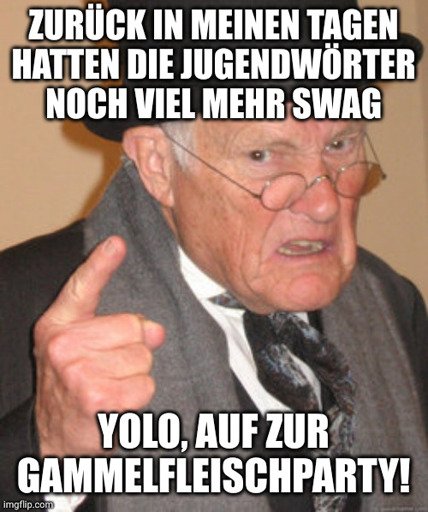 Hat das ernsthaft mal jemand gesagt? Ok Yolo und swag vielleicht aber gammelfleischparty war ja iwie damals schon drüber.