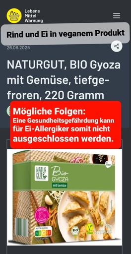 Wäre mehr drin, was allergen ist, hätte es neben dem Ei auch im Rückruf gestanden. Und wenn Leute sehr ernsthaft vegan leben, werden sie den ersten Bissen mit Rindfleisch sowieso ausspucken.