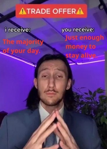 Working in modernity involves receiving a piece of paper (or digits on a computer screen) that isn’t guaranteed to be exchangeable for sustenance (not enough “digits” or “paper” pieces, the core of the meme).