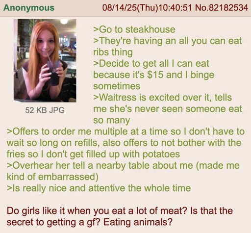 arrow-up1325arrow-down1imageAnon goes to a steakhousesh.itjust.works🍹Early to RISA 🧉@sh.itjust.worksM to Greentext@sh.itjust.works · 2 months agomessage-square32linkfedilink
