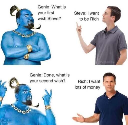 minus-squaredreadbeef@lemmy.dbzer0.comlinkfedilinkEnglisharrow-up8·edit-215 days ago“I wish I had a lot of money.” “Done. You now have had a lot of money, but no longer. No more wishes ☺️”
