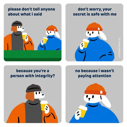 Many years ago, a girl in our class was telling a friend and me a secret. Then she addressed my friend to say that it is a secret and he shouldn’t tell it to others. My friend complained that he knew to keep it secret and why she wasn’t addressing me as well. Then she said that I don’t tell stuff like that to others.