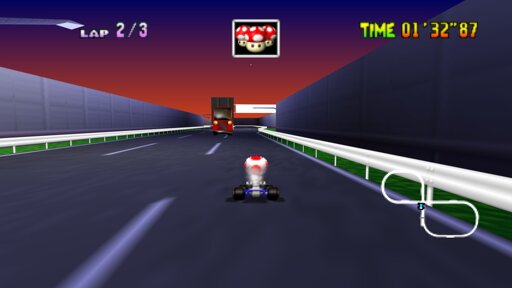 Today’s game is Mario Kart 64. I was messing around in the Time Trials mode today. I meant to do a Grand Prix but got distracted just looking around. I decided to go backwards on Toad’s Turnpike for example, and I guess the car horns bugged out or something because they kept honking at me.