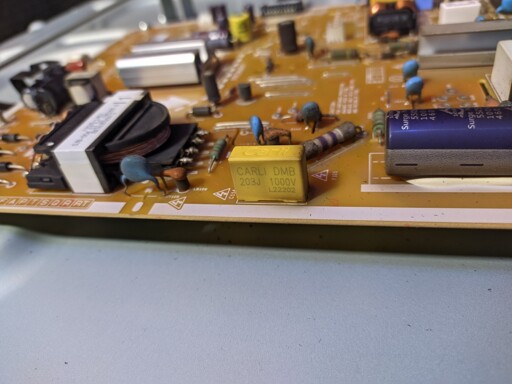 added top view in OP, all the other components that looked charred got cleaned up with a brush, this is the only one which looked damaged. currently waiting for the TV to empty all the capacitors before I attempt to remove the board.